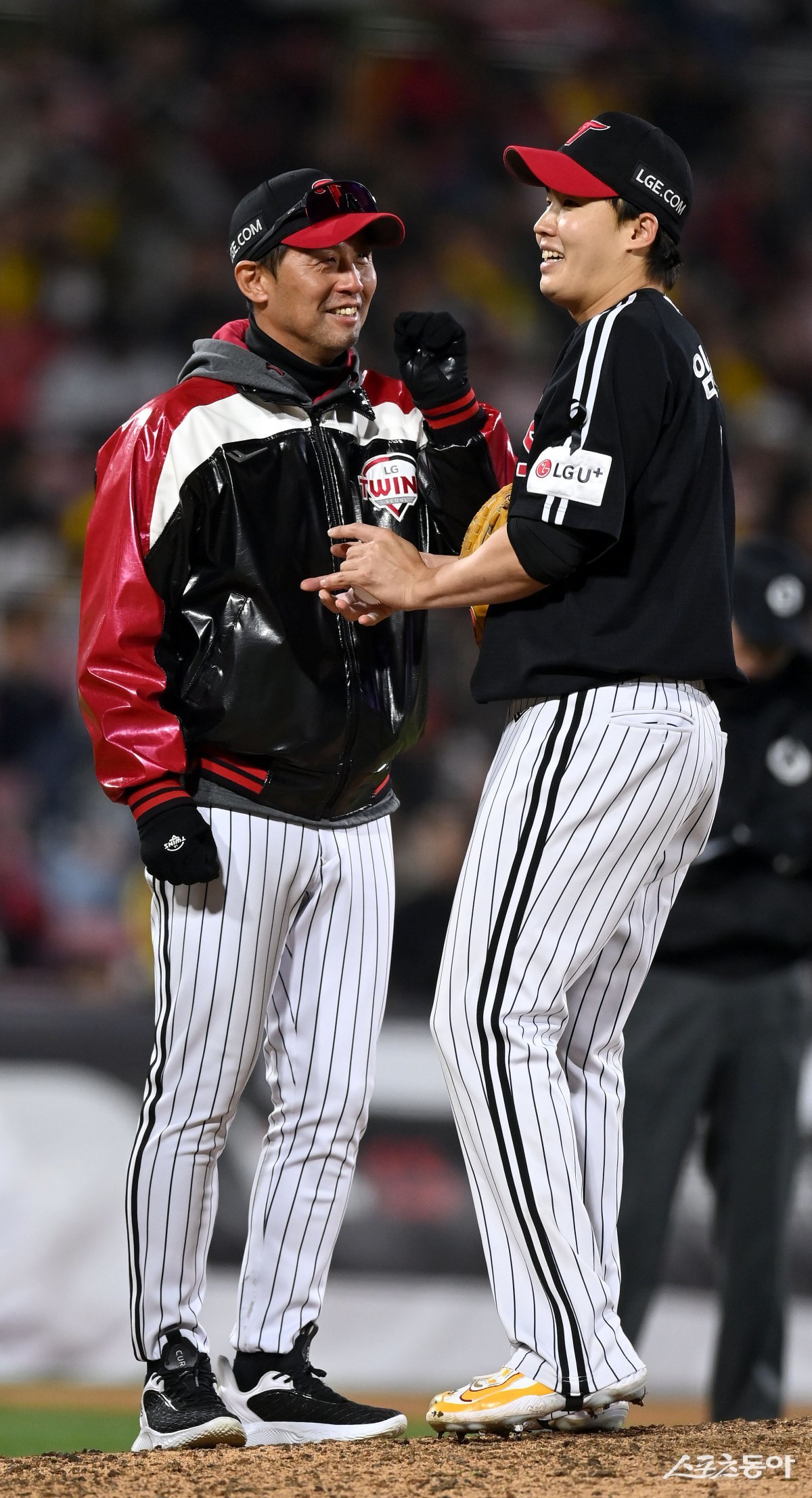 3일 수원KT위즈파크에서 ‘2025 신한은행 SOL뱅크 KBO리그’ LG 트윈스와 KT 위즈 경기가 열렸다. 선발 등판한 LG 임찬규가 6회말 안타를 허용하자 김광삼 코치가 마운드에 올라 이야기를 하고 있다. 수원|김종원 기자 won@donga.com