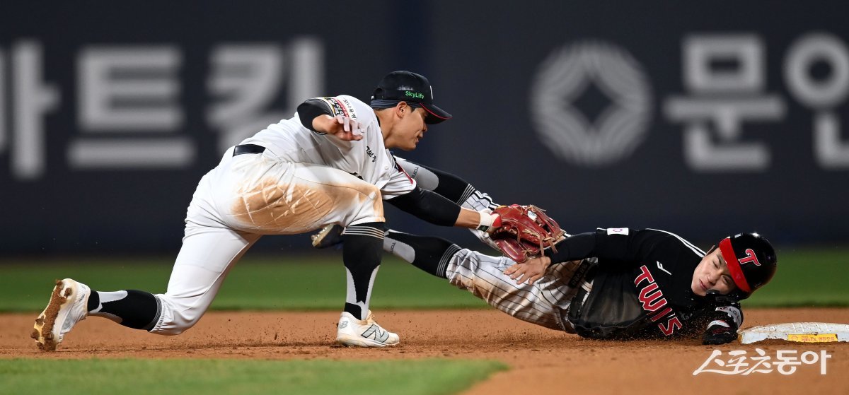 3일 수원KT위즈파크에서 ‘2025 신한은행 SOL뱅크 KBO리그’ LG 트윈스와 KT 위즈 경기가 열렸다. 8회초 1사 2루 LG 2루주자 최원영이 협살에 걸려 2루로 귀루했으나 태그 아웃되고 있다. 수원|김종원 기자 won@donga.com