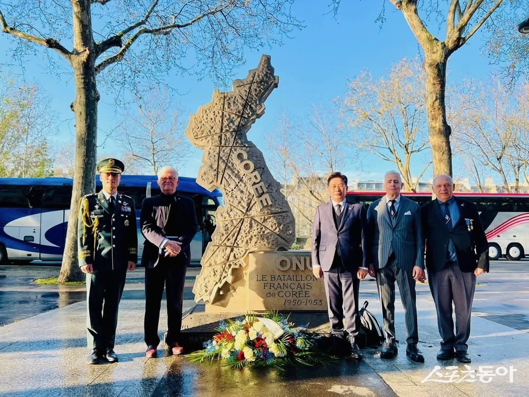 전진선 군수를 비롯한 대표단은 ‘한국전 참전 유엔 프랑스 대대 광장’에 조성된 6·25전쟁 참전 기념비에 헌화하고 묵념했다. 이 기념비는 1989년 한반도 모양으로 제작됐다. 2021년에는 프랑스 대대 소속으로 참전해 전사한 한국인 장병들의 이름이 추가로 새겨졌다.