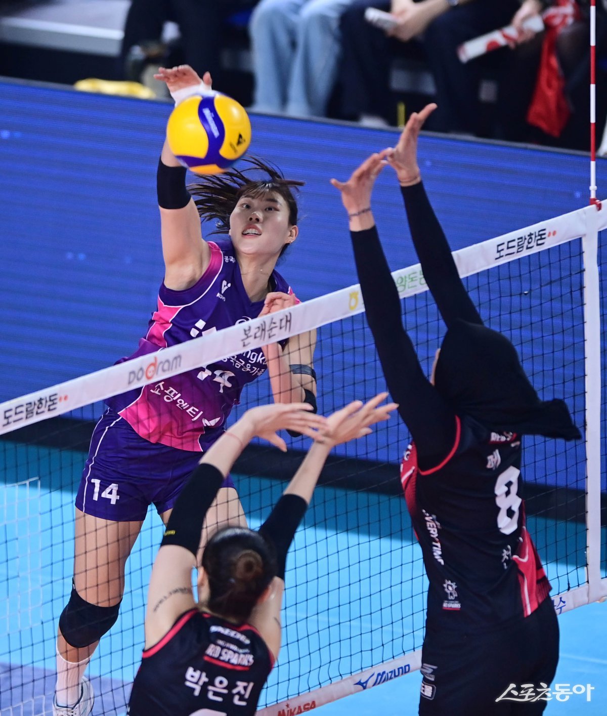 6일 대전 한밭종합운동장 충무체육관에서 열린 ‘2024-2025 V리그 포스트시즌’ 여자부 챔피언결정전 4차전 정관장과 흥국생명의 경기에서 흥국생명 정윤주가 정관장 블로커 앞에서 스파이크를 하고 있다. 대전 | 주현희 기자 teth1147@donga.com
