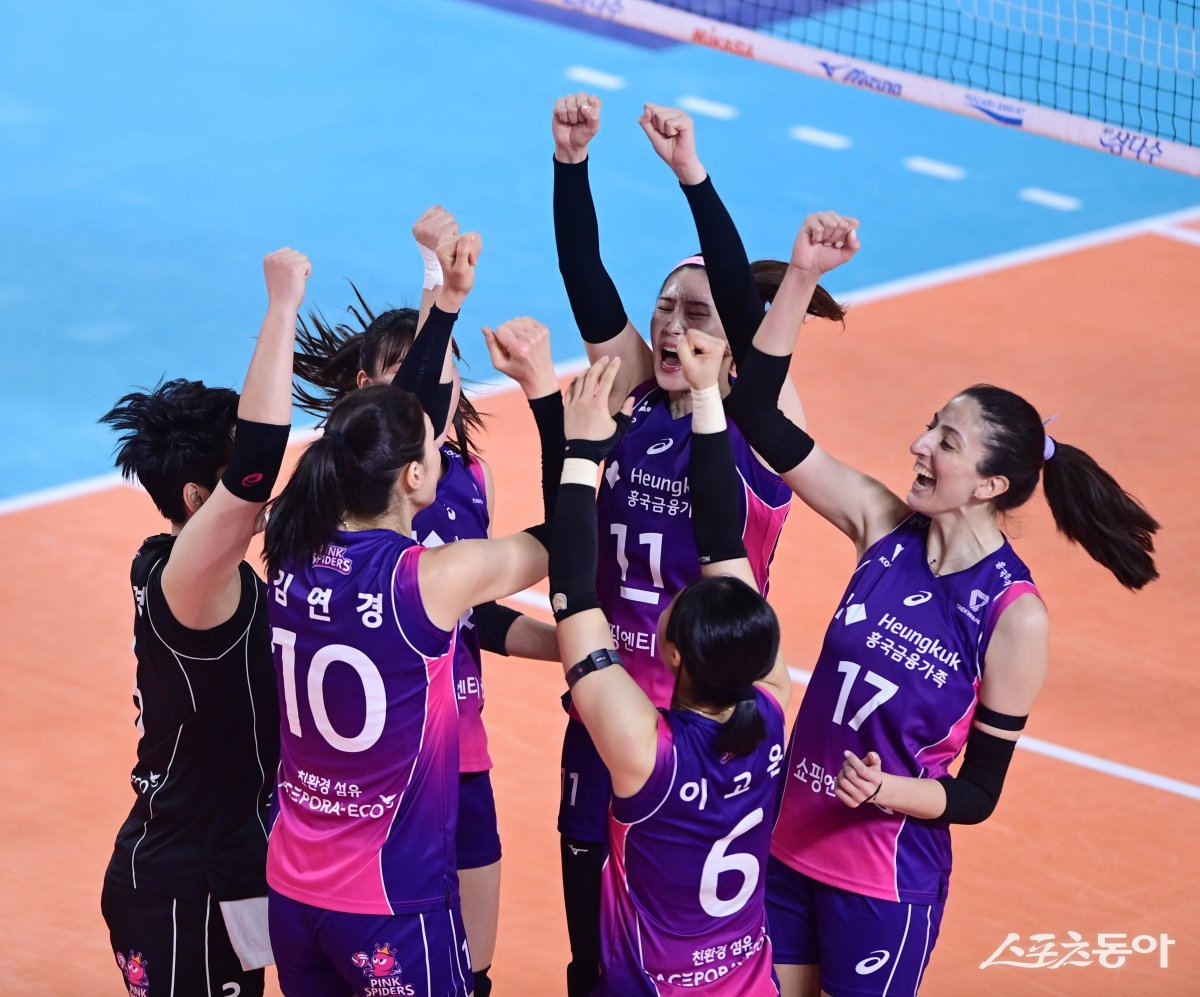 6일 대전 한밭종합운동장 충무체육관에서 열린 ‘2024-2025 V리그 포스트시즌’ 여자부 챔피언결정전 4차전 정관장과 흥국생명의 경기에서 팀 득점에 성공한 흥국생명 선수들이 세리머니를 하고 있다. 대전 | 주현희 기자 teth1147@donga.com