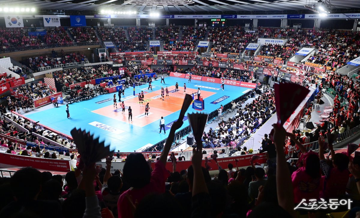 6일 대전 한밭종합운동장 충무체육관에서 열린 ‘2024-2025 V리그 포스트시즌’ 여자부 챔피언결정전 4차전 정관장과 흥국생명의 경기에서 팬들이 응원을 하고 있다. 대전 | 주현희 기자 teth1147@donga.com