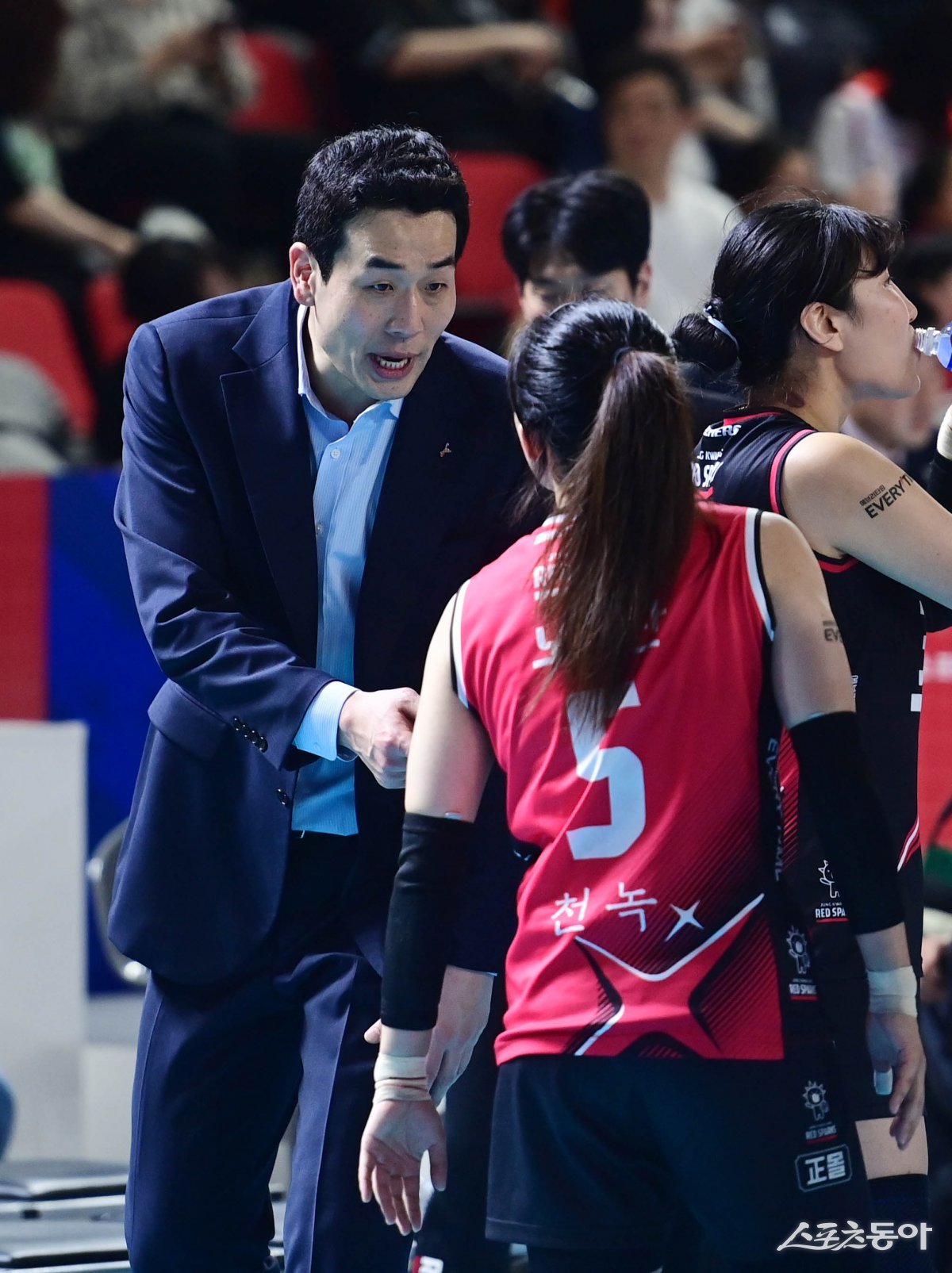 6일 대전 한밭종합운동장 충무체육관에서 열린 ‘2024-2025 V리그 포스트시즌’ 여자부 챔피언결정전 4차전 정관장과 흥국생명의 경기에서 정관장 고희진 감독이 선수들에게 작전 지시를 하고 있다. 대전 | 주현희 기자 teth1147@donga.com