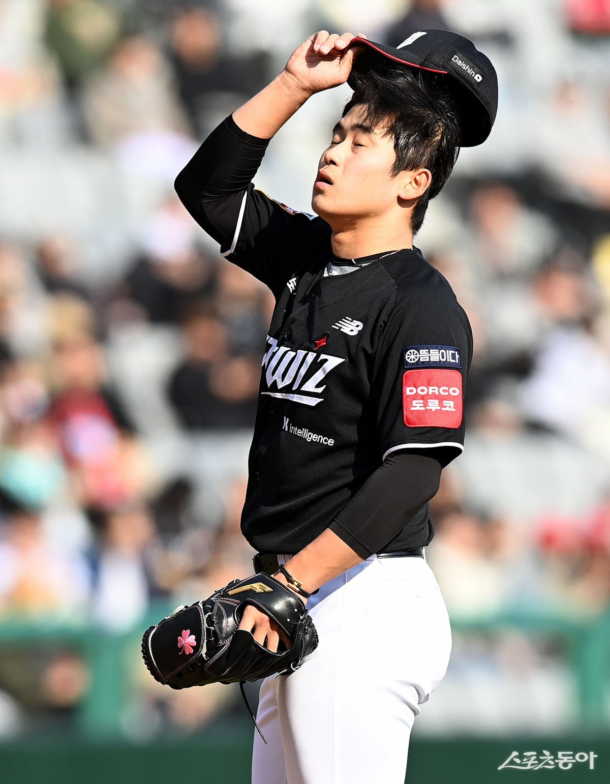 6일 인천 SSG 랜더스필드에서 ‘2025 신한 SOL 뱅크 KBO리그’ SSG 랜더스와 KT 위즈의 경기가 열렸다. 9회말 1사 1, 2루에서 볼넷을 허용한 KT 마무리 박영현이 아쉬워하고 있다. 인천 | 김민성 기자 marineboy@donga.com