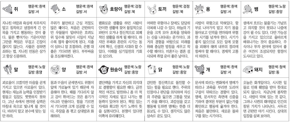 닭띠 : 강인한정신력으로돌진할수있는힘을필요로한다.주위의인정이나판단을의식하여자신의주관을잃으면고통을맛보기쉬울때이다.과감성을갖고행동에임하면명예는한층더돋보일수있다.생각지도않은상속의운도있다.