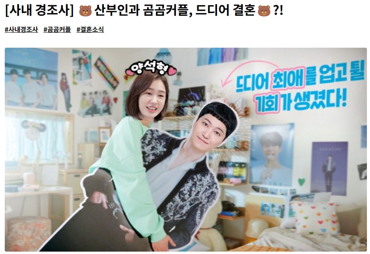 게시물에는 “너무나 귀엽고 행복한 부부가 될 게 뻔하게 보이는 부부인만큼 이 커플이 드디어 결혼한다고 하네요. 직장동료에서 커플로, 커플에서 부부가 되는 과정을 다 같이 본 거나 마찬가지라 제가 다 너무 행복하네요. 앞으로의 신혼생활이 기대되네요”라는 내용이 담겨 반가움을 샀다.