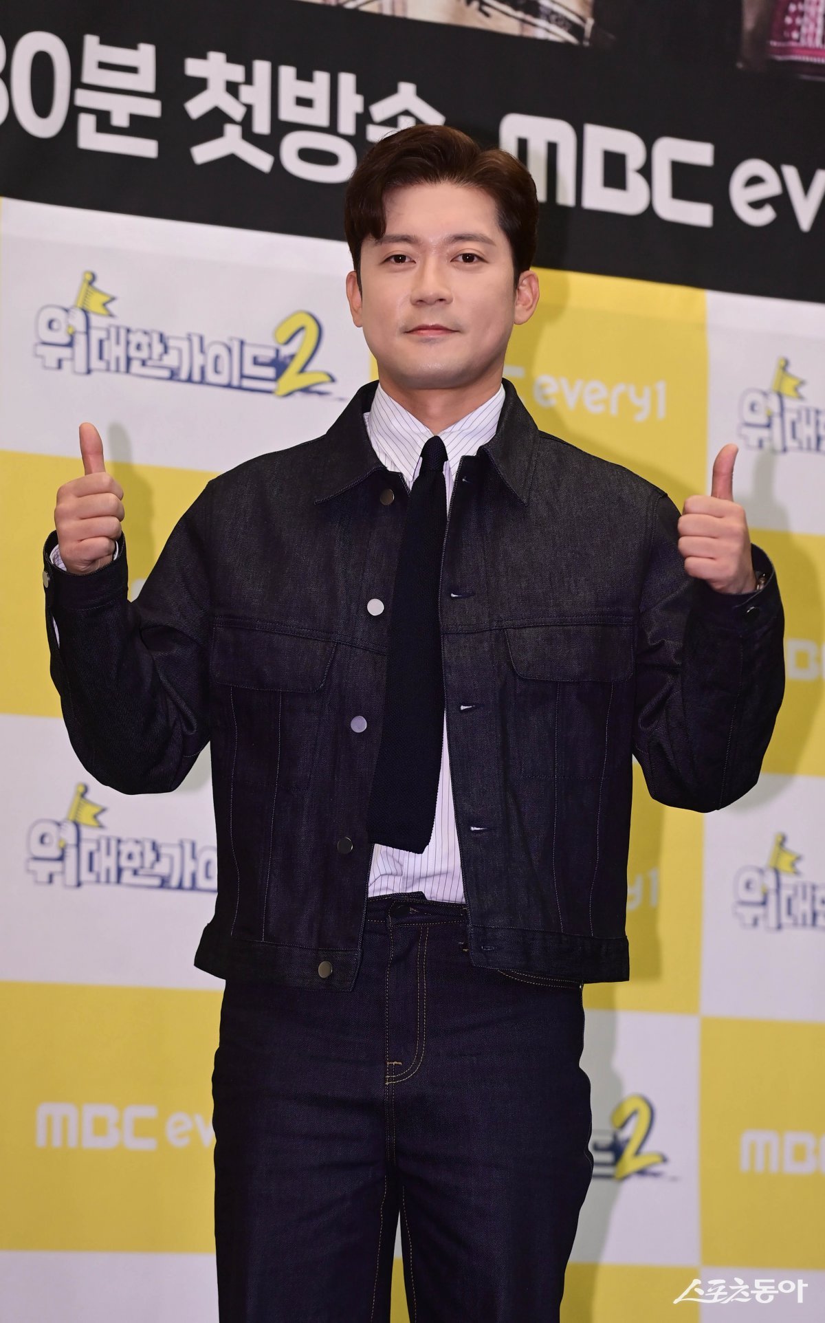 전 아나운서 김대호가 8일 서울 마포구 스탠포드호텔에서 열린 MBC에브리원 ‘위대한 가이드2’ 제작발표회에서 포즈를 취하고 있다. 주현희 기자 teth1147@donga.com