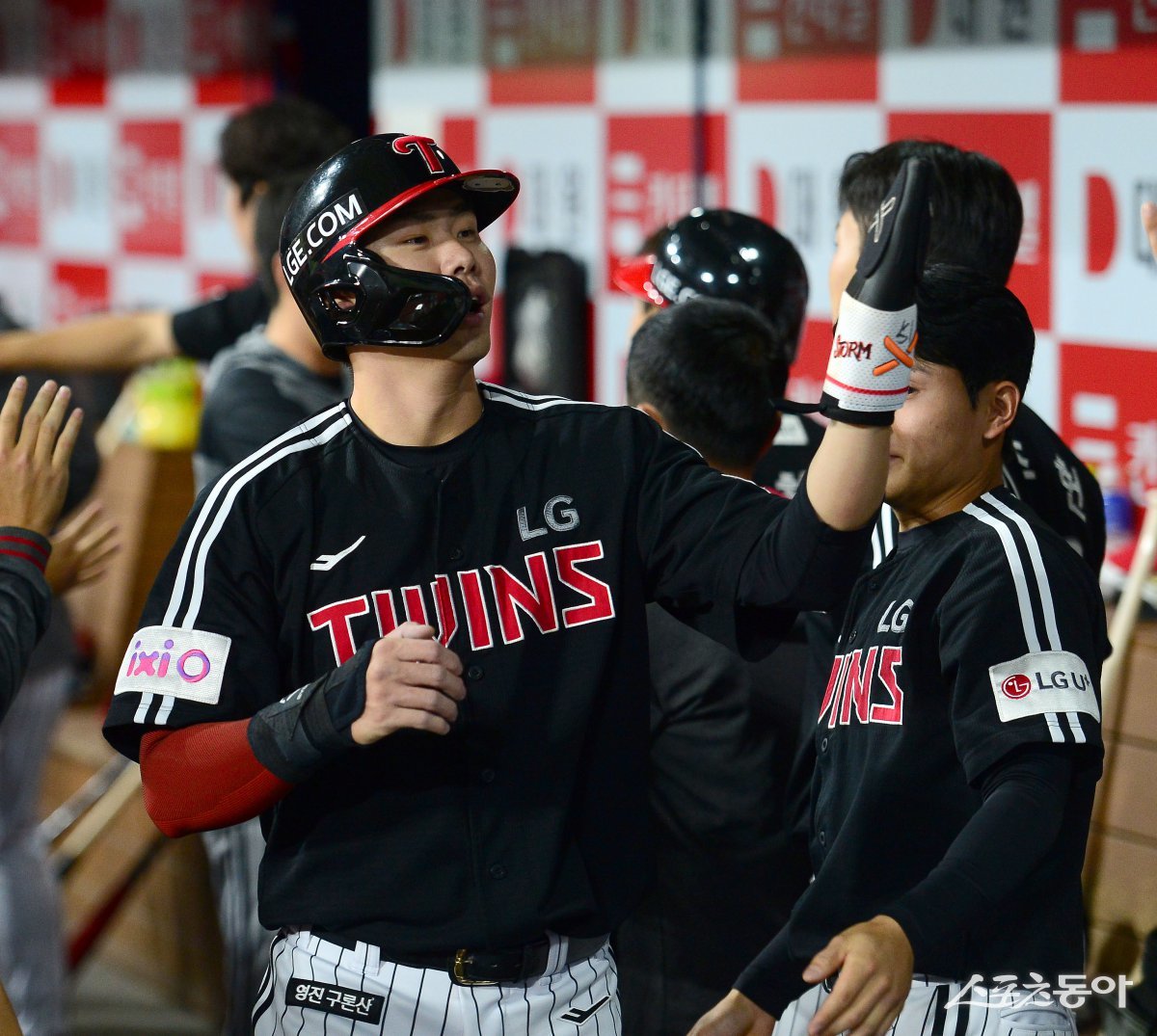 8일 서울 고척스카이돔에서 ‘2025 신한은행 SOL뱅크 KBO리그’ LG 트윈스와 키움 히어로즈 경기가 열렸다. 1회초 무사 만루 LG 안타 때 득점한 3루주자 홍창기가 하이파이브 하고 있다. 고척|김종원 기자 won@donga.com