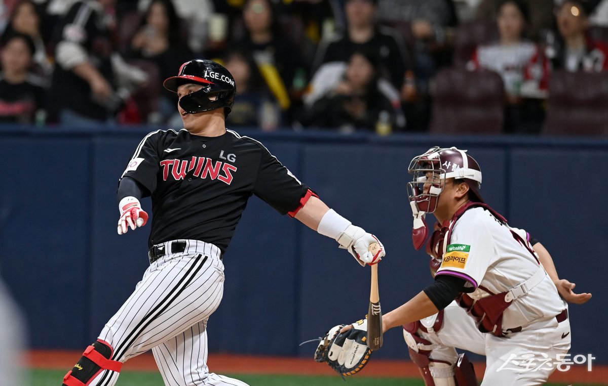 8일 서울 고척스카이돔에서 ‘2025 신한은행 SOL뱅크 KBO리그’ LG 트윈스와 키움 히어로즈 경기가 열렸다. 2회초 2사 1,2루 LG 박동원 1타점 적시타를 치고 있다. 고척|김종원 기자 won@donga.com