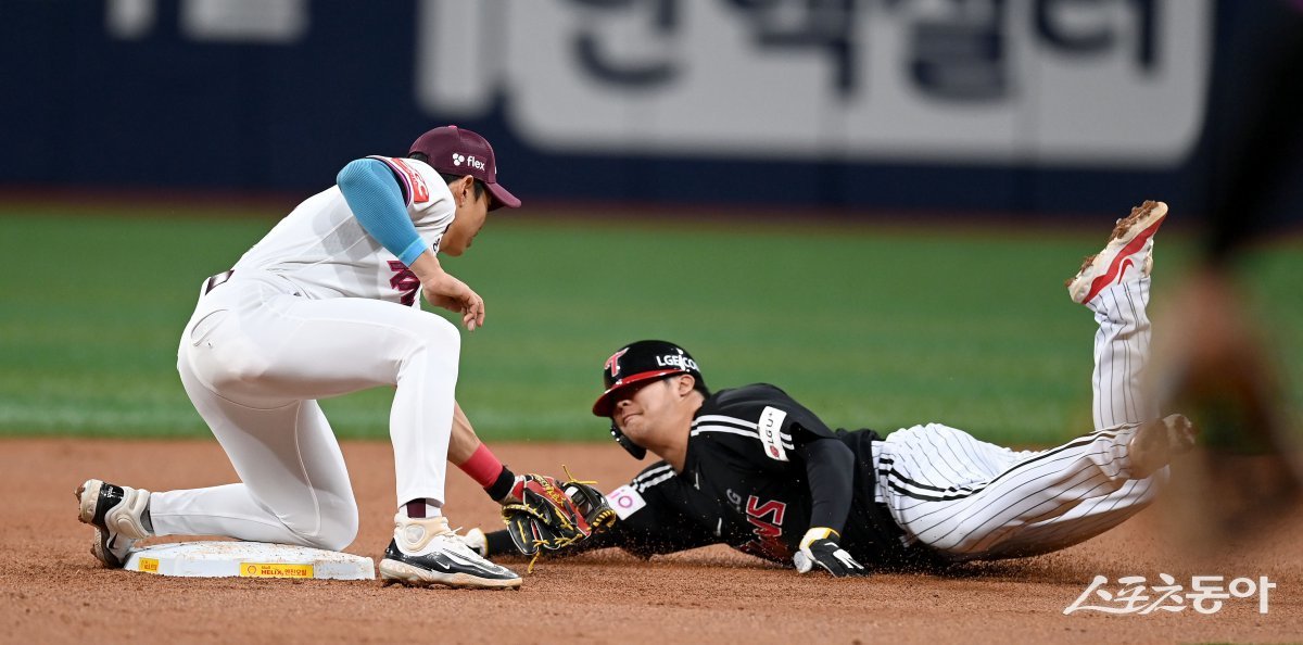 8일 서울 고척스카이돔에서 ‘2025 신한은행 SOL뱅크 KBO리그’ LG 트윈스와 키움 히어로즈 경기가 열렸다. 1회초 2사 1루 상황에서 LG 1루주자 문보경이 2루 도루를 시도했은아 아웃되고 있다. 고척|김종원 기자 won@donga.com