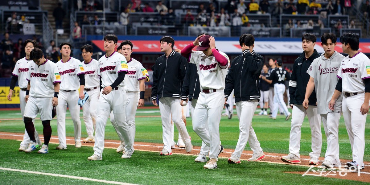 8일 서울 고척스카이돔에서 ‘2025 신한은행 SOL뱅크 KBO리그’ LG 트윈스와 키움 히어로즈 경기가 열렸다. 1-13으로 패하며 3연패에 빠진 키움 선수들이 더그아웃으로 항하고 있다. 고척|김종원 기자 won@donga.com