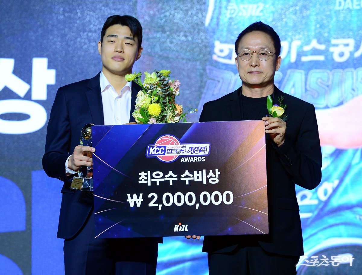9일 서울 삼성동 그랜드 인터컨티넨탈 서울 파르나스에서 ‘2024-2025 KCC 프로농구 시상식’이 열렸다. 최우수 수비상을 수상한 정성우(한국가스공사)가 IB스포츠 김정환 대표이사와 기념촬영을 하고 있다. 김민성 기자 marineboy@donga.com
