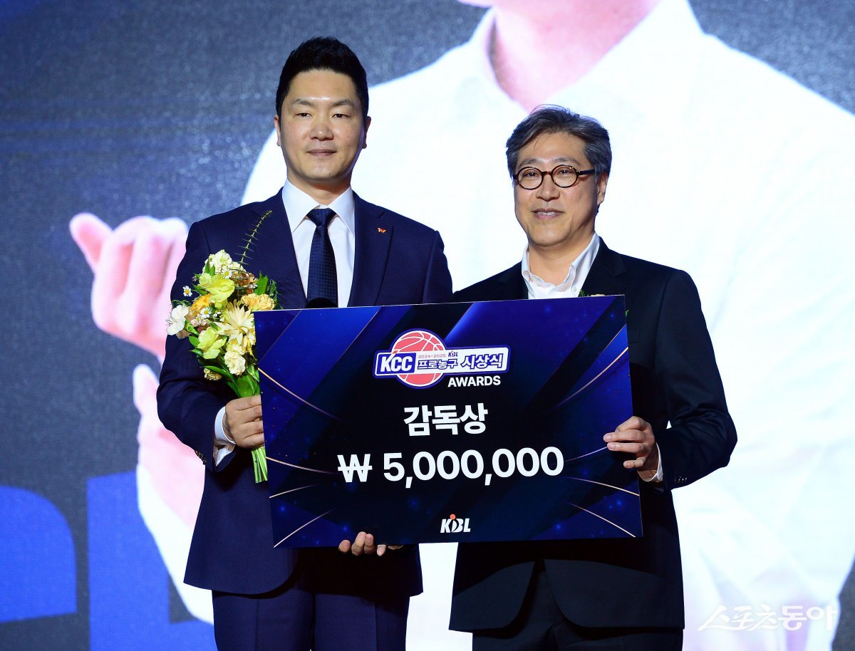 9일 서울 삼성동 그랜드 인터컨티넨탈 서울 파르나스에서 ‘2024-2025 KCC 프로농구 시상식’이 열렸다. 감독상을 수상한 전희철 감독(SK)이 KBA 정재용 부회장과 기념촬영을 하고 있다. 김민성 기자 marineboy@donga.com