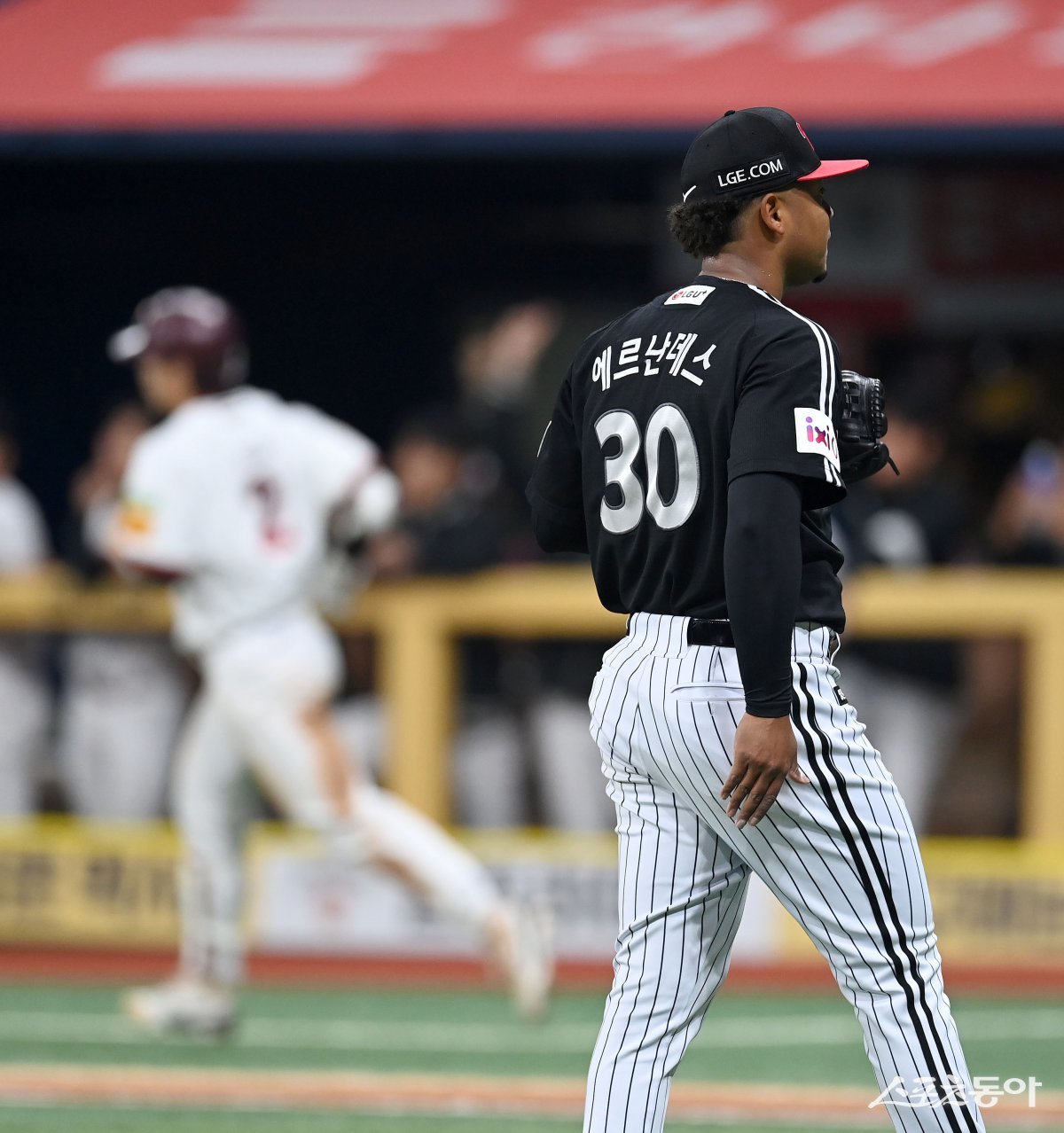 9일 서울 고척스카이돔에서 ‘2025 신한은행 SOL뱅크 KBO리그’ LG 트윈스와 키움 히어로즈 경기가 열렸다. LG 선발 에르난데스가 3회말 2사 키움 이주형에게 우월 솔로 홈런을 허용하고 있다. 고척|김종원 기자 won@donga.com