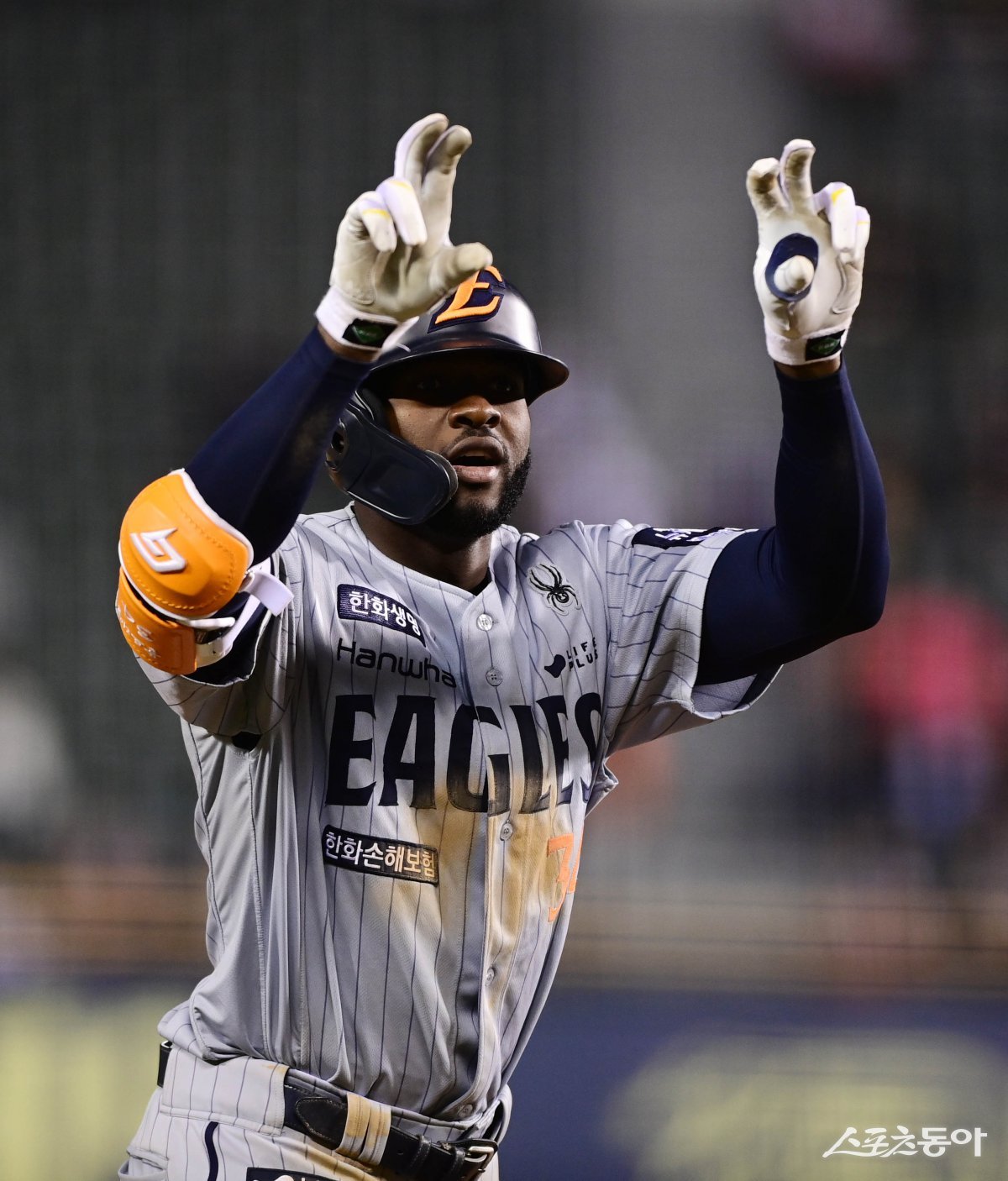 9일 서울 잠실야구장에서 열린 ‘2025 신한 SOL Bank KBO리그’ 한화 이글스와 두산 베어스의 경기에서 5회초 2사 1, 2루 한화 플로리얼이 동점 2타점 우전 3루타를 친 후 세리머니를 하고 있다. 잠실 | 주현희 기자 teth1147@donga.com
