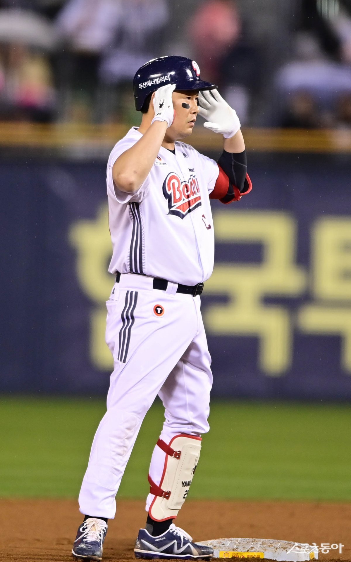 9일 서울 잠실야구장에서 열린 ‘2025 신한 SOL Bank KBO리그’ 한화 이글스와 두산 베어스의 경기에서 3회말 2사 1루 두산 양의지가 역전 1타점 중전 2루타를 친 후 세리머니를 하고 있다. 잠실 | 주현희 기자 teth1147@donga.com