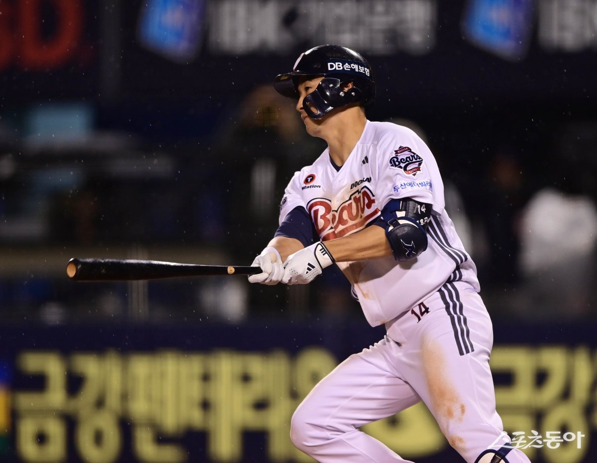 9일 서울 잠실야구장에서 열린 ‘2025 신한 SOL Bank KBO리그’ 한화 이글스와 두산 베어스의 경기에서 2회말 2사 1루 두산 박계범이 동점 1타점 좌전 2루타를 치고 있다. 잠실 | 주현희 기자 teth1147@donga.com