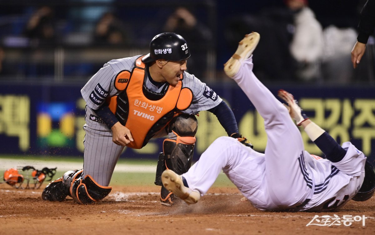 9일 서울 잠실야구장에서 열린 ‘2025 신한 SOL Bank KBO리그’ 한화 이글스와 두산 베어스의 경기에서 9회말 1사 3루 두산의 땅볼 때 한화 포수 이재원이 3루주자를 태그 아웃시키고 있다. 잠실 | 주현희 기자 teth1147@donga.com