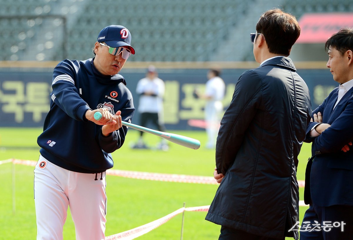 10일 서울 잠실야구장에서 ‘2025 신한 SOL 뱅크 KBO리그’ 두산 베어스와 한화 이글스의 경기가 열린다. 경기 전 두산 이승엽 감독이 해설위원들 앞에서 타격 시범을 펼치고 있다. 잠실 | 김민성 기자 marineboy@donga.com