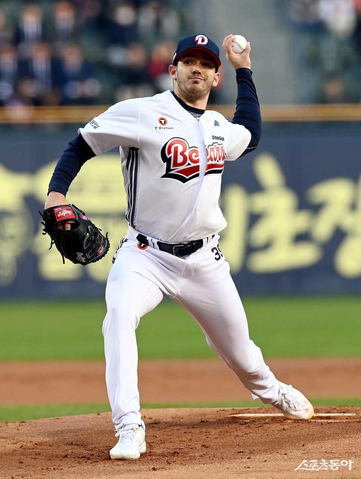 10일 서울 잠실야구장에서 ‘2025 신한 SOL 뱅크 KBO리그’ 두산 베어스와 한화 이글스의 경기가 열렸다. 두산 선발투수 잭로그가 힘차게 볼을 던지고 있다. 잠실 | 김민성 기자 marineboy@donga.com