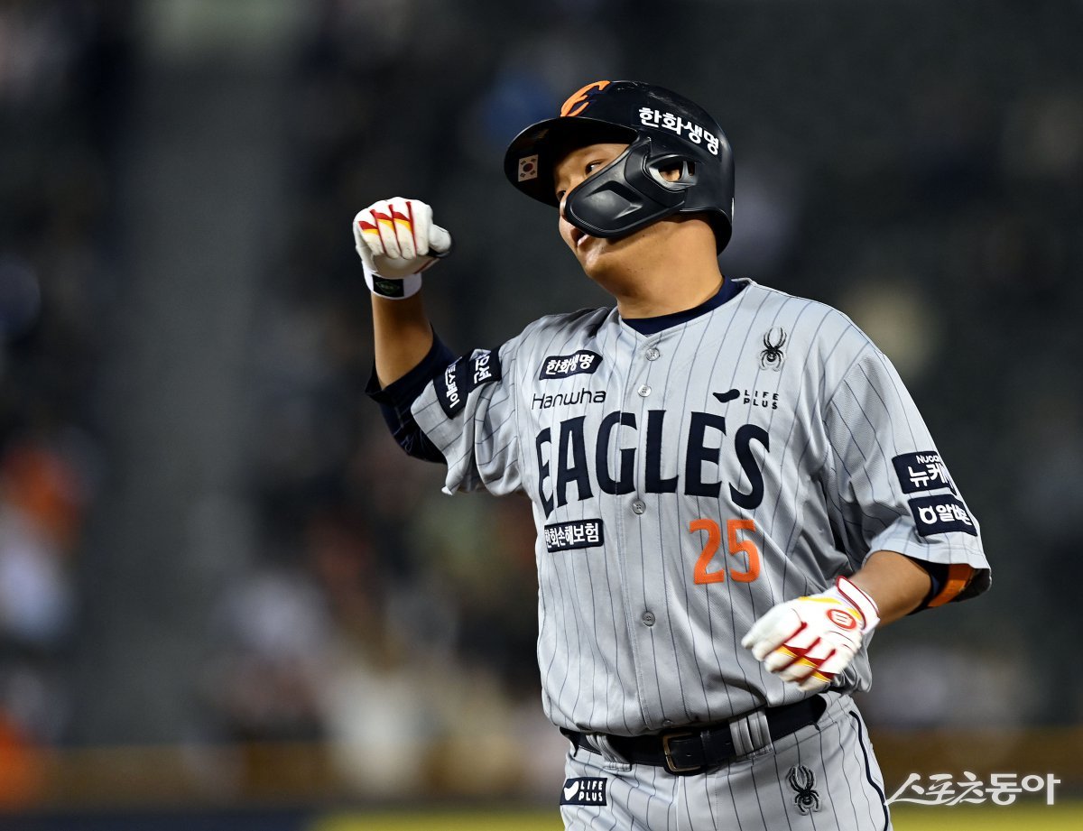 10일 서울 잠실야구장에서 ‘2025 신한 SOL 뱅크 KBO리그’ 두산 베어스와 한화 이글스의 경기가 열렸다. 6회초 2사 2, 3루에서 한화 김태연이 2타점 적시타를 날린 후 환호하고 있다. 잠실 | 김민성 기자 marineboy@donga.com