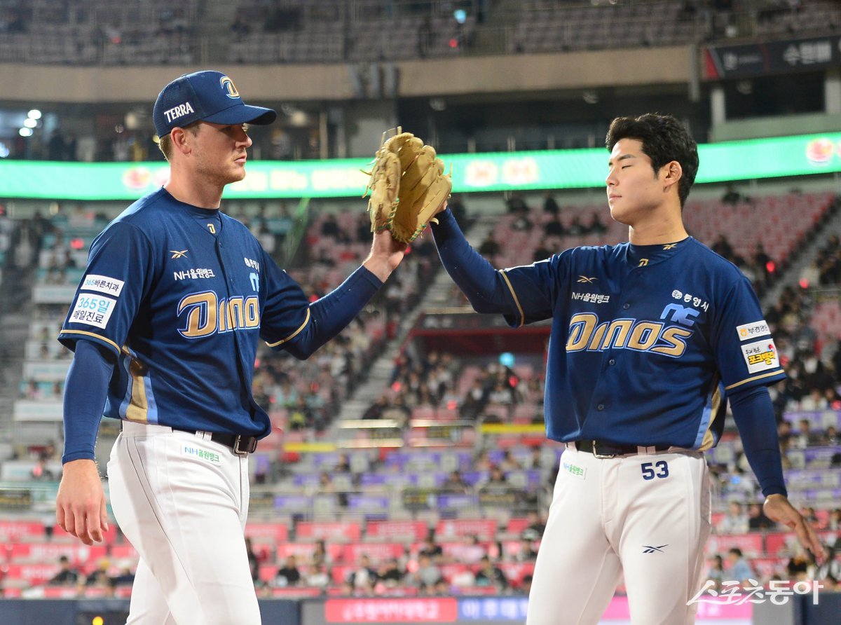 10일 수원KT위즈파크에서 열린 ‘2025 신한 SOL Bank KBO리그’ NC 다이노스와 KT 위즈의 경기에서 7회말 수비를 마친 NC 라일리가 더그아웃 앞에서 동료와 기쁨을 나누고 있다. 수원 | 주현희 기자 teth1147@donga.com