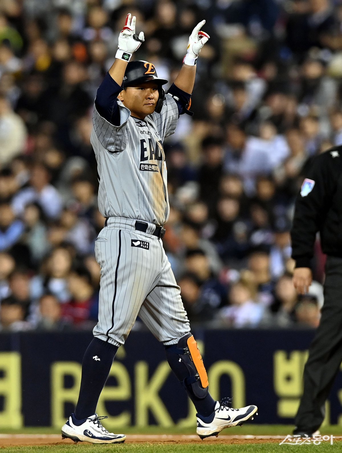 10일 서울 잠실야구장에서 ‘2025 신한 SOL 뱅크 KBO리그’ 두산 베어스와 한화 이글스의 경기가 열렸다. 7회초 1사 1, 2루에서 한화 김태연이 1타점 적시타를 날린 후 세리머니를 펼치고 있다. 잠실 | 김민성 기자 marineboy@donga.com
