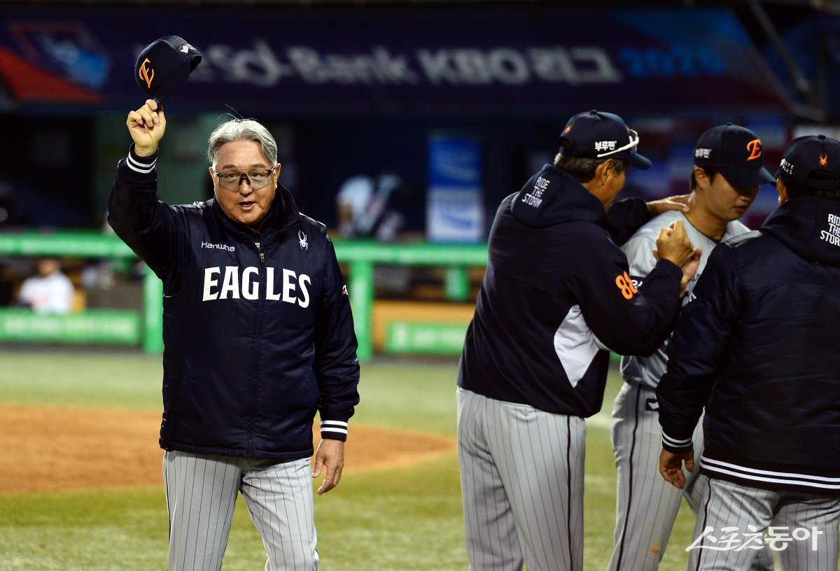 10일 서울 잠실야구장에서 ‘2025 신한 SOL 뱅크 KBO리그’ 두산 베어스와 한화 이글스의 경기가 열렸다. 한화가 두산을 상대로 7-2 승리 후 김경문 감독이 팬들에게 인사하고 있다. 잠실 | 김민성 기자 marineboy@donga.com