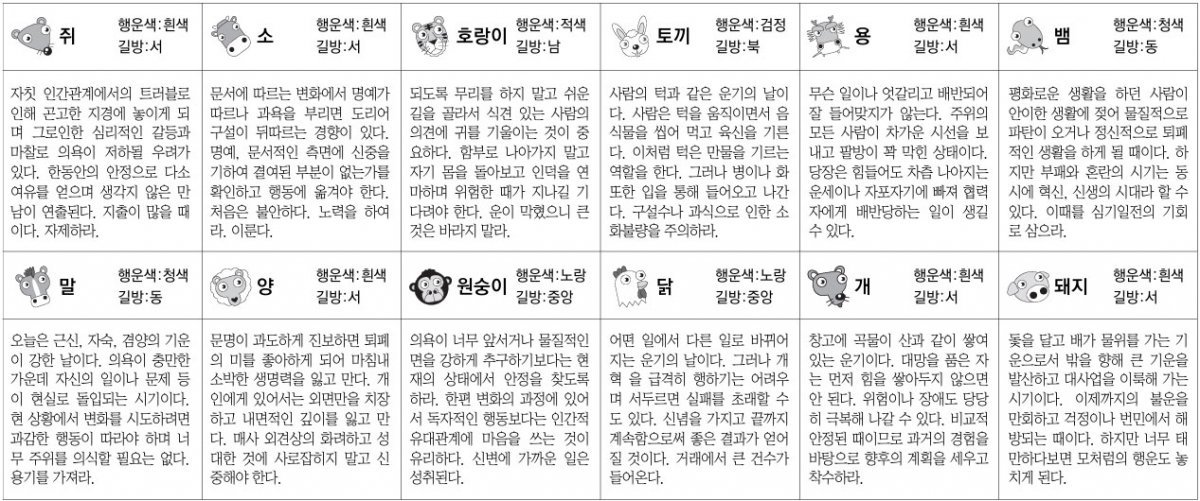 용띠 : 무슨일이나엇갈리고배반되어잘들어맞지가않는다.주위의모든사람이차가운시선을보내고팔방이꽉막힌상태이다.당장은힘들어도차츰나아지는운세이나자포자기에빠져협력자에게배반당하는일이생길수있다.