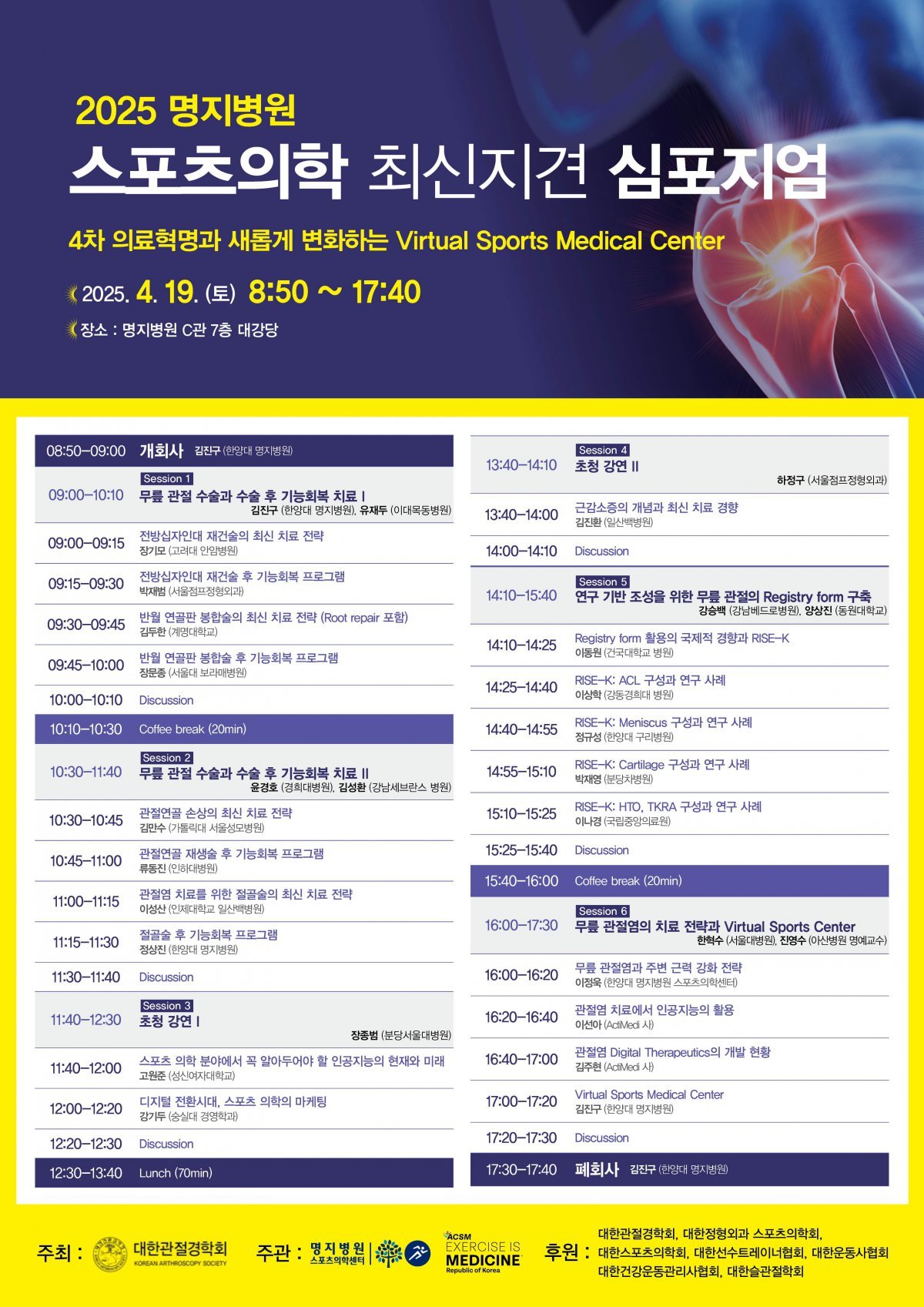 명지병원 스포츠의학센터(센터장 김진구)는 19일 오전 병원 C관 7층 대강당에서 ‘2025 스포츠의학 최신지견 심포지엄’을 개최한다.