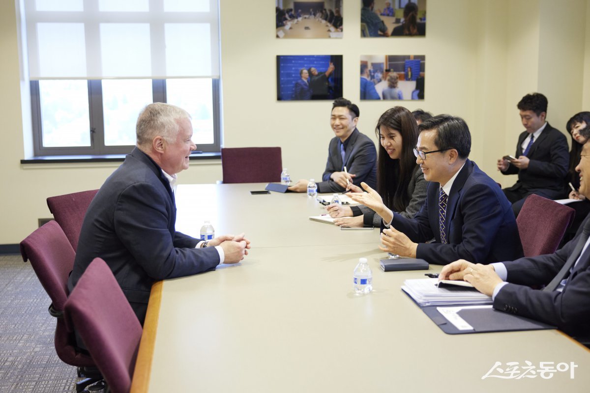 김동연 경기도지사가 미국 미시간주 현지시각 10일 오후 미시간대 포드스쿨에서 스티븐 비건 前 국무부 부장관과 면담을 하고 있다. 사진제공|경기도