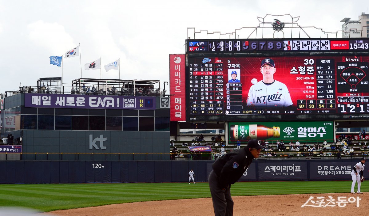 13일 경기도 수원 KT위즈파크에서 ‘2025 신한 SOL 뱅크 KBO리그’ KT 위즈와 삼성 라이온즈의 경기가 열렸다. 강풍을 동반한 변덕스러운 날씨로 인해 외야의 깃발이 휘날리고 있다. 수원 | 김민성 기자 marineboy@donga.com