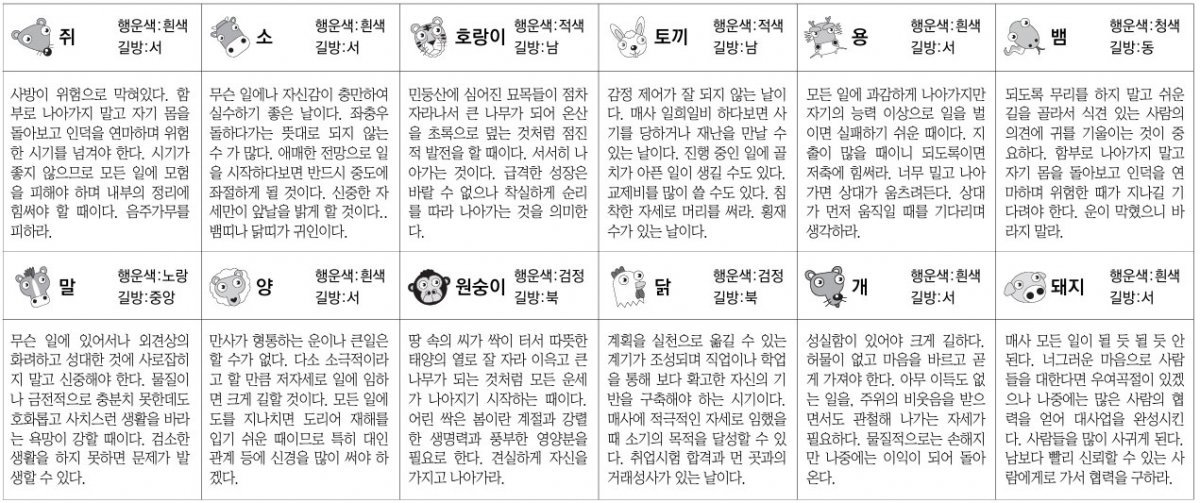 소띠 : 무슨일에나자신감이충만하여실수하기좋은날이다.좌충우돌하다가는뜻대로되지않는수가많다.애매한전망으로일을시작하다보면반드시중도에좌절하게될것이다.신중한자세만이앞날을밝게할것이다..뱀띠나닭띠가귀인이다.