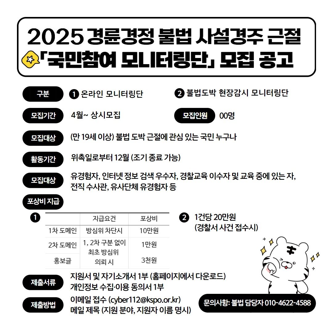 서울올림픽기념국민체육진흥공단(이사장 하형주) 경륜경정총괄본부가 11일부터 ‘2025년 경륜경정 불법 사설 경주 근절을 위한 국민 참여 모니터링단’을 모집한다.