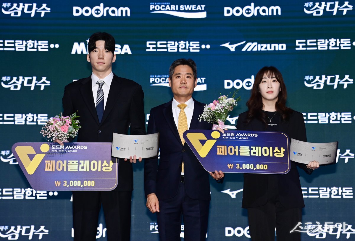14일 서울 서대문구 스위스그랜드호텔에서 열린 ‘도드람 2024-2025 V-리그 시상식’에서 페어플레이상을 수상한 현대캐피탈 허수봉, IBK기업은행 황민경이 기념 촬영을 하고 있다. 주현희 기자 teth1147@donga.com