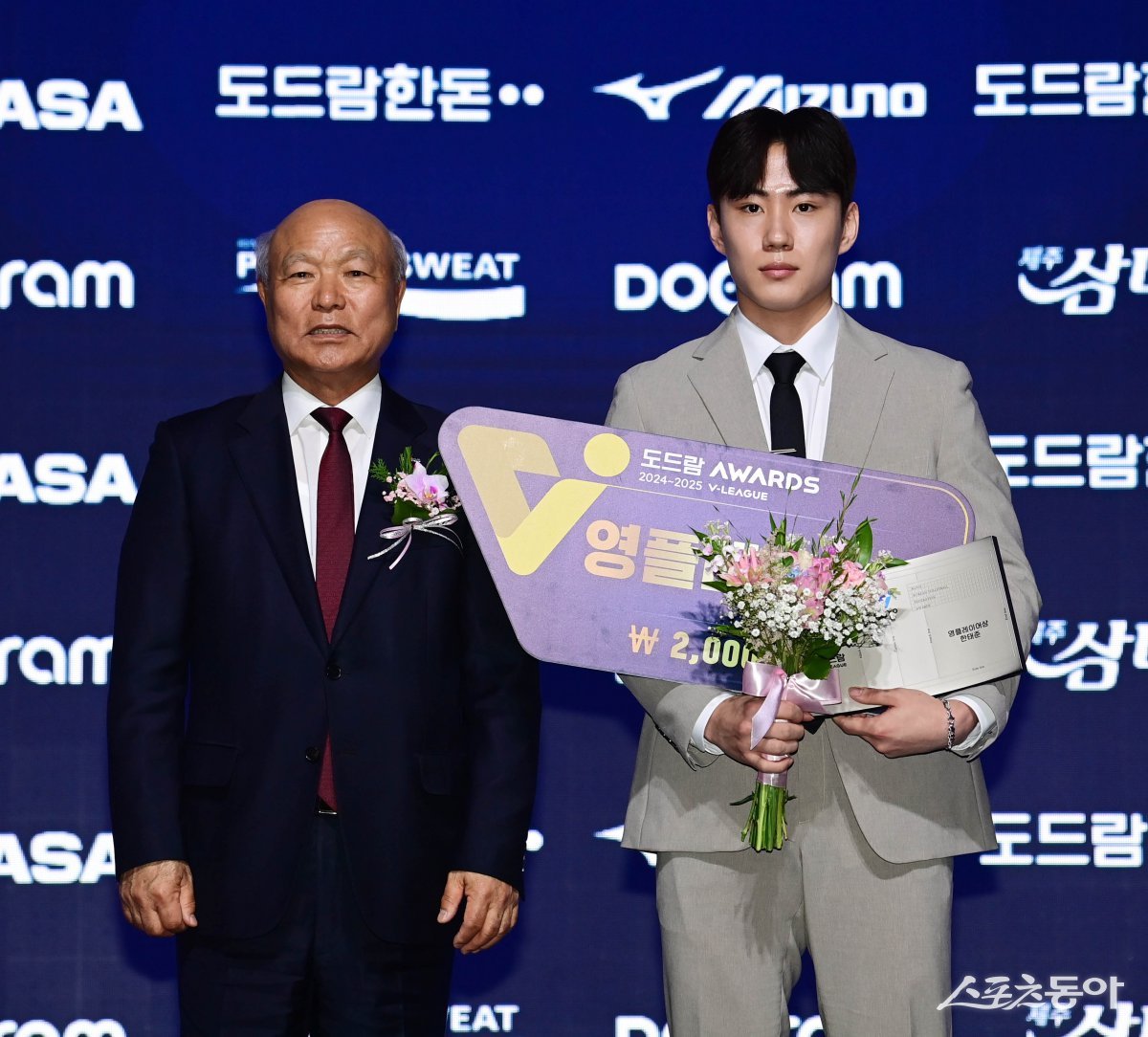 14일 서울 서대문구 스위스그랜드호텔에서 열린 ‘도드람 2024-2025 V-리그 시상식’에서 남자부 영플레이어상을 수상한 우리카드 한태준이 박광욱 도드람양돈농협조합장과 기념 촬영을 하고 있다. 주현희 기자 teth1147@donga.com