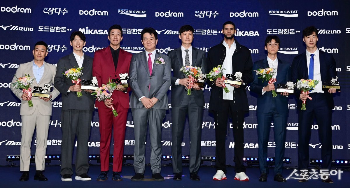 14일 서울 서대문구 스위스그랜드호텔에서 열린 ‘도드람 2024-2025 V-리그 시상식’에서 20주년 역대 남자부 베스트7에 선정된 여오현, 한선수, 신영석, 이선규, 레오, 곽승석, 박철우가 기념 촬영을 하고 있다. 주현희 기자 teth1147@donga.com