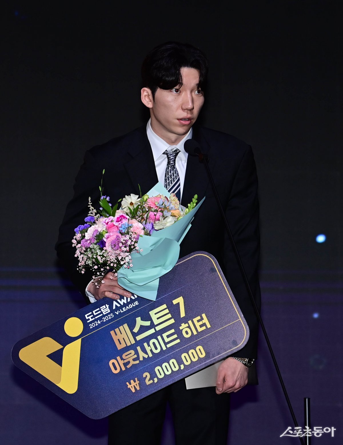 14일 서울 서대문구 스위스그랜드호텔에서 열린 ‘도드람 2024-2025 V-리그 시상식’에서 남자부 베스트7에 선정된 현대캐피탈 허수봉이 소감을 말하고 있다. 주현희 기자 teth1147@donga.com