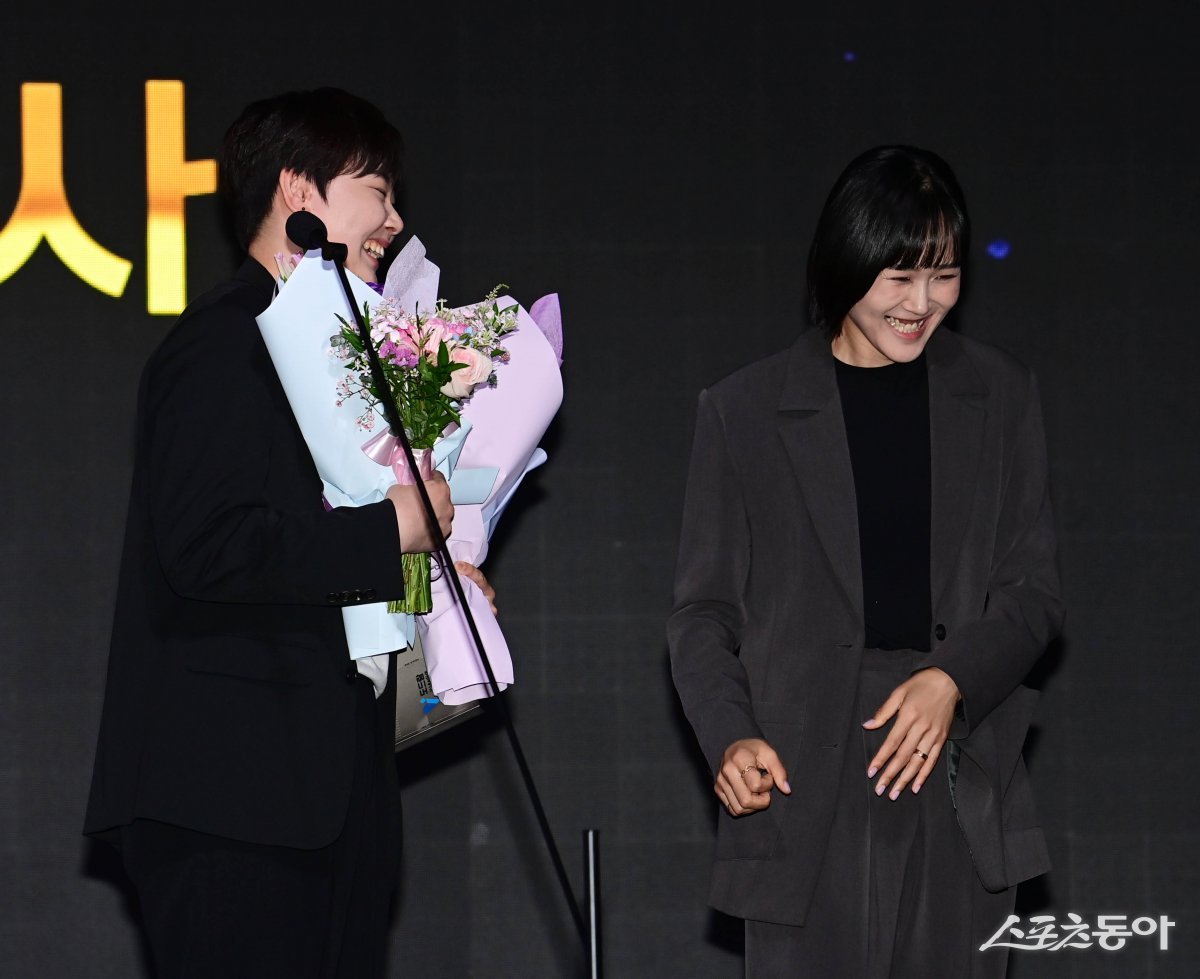 14일 서울 서대문구 스위스그랜드호텔에서 열린 ‘도드람 2024-2025 V-리그 시상식’에서 여자부 영플레이어상을 수상한 한국도로공사 김다은이 임명옥으로부터 꽃다발을 받고 있다. 주현희 기자 teth1147@donga.com