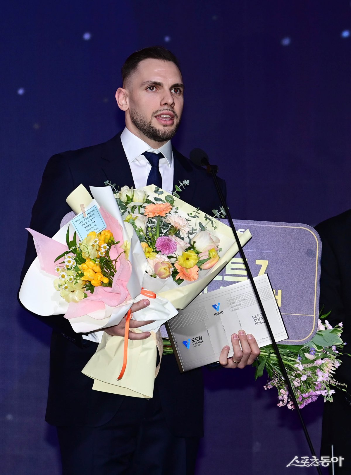 14일 서울 서대문구 스위스그랜드호텔에서 열린 ‘도드람 2024-2025 V-리그 시상식’에서 남자부 베스트7에 선정된 KB손해보험 비예나가 소감을 말하고 있다. 주현희 기자 teth1147@donga.com
