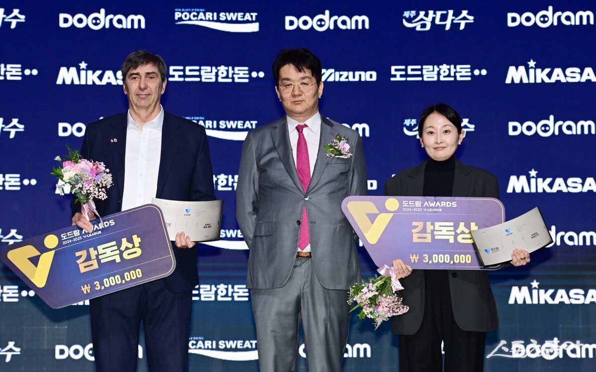 14일 서울 서대문구 스위스그랜드호텔에서 열린 ‘도드람 2024-2025 V-리그 시상식’에서 감독상을 수상한 현대캐피탈 필립 블랑 감독과 흥국생명 아본단자 감독을 대신해 박지나 사무국장이 기념 촬영을 하고 있다. 주현희 기자 teth1147@donga.com