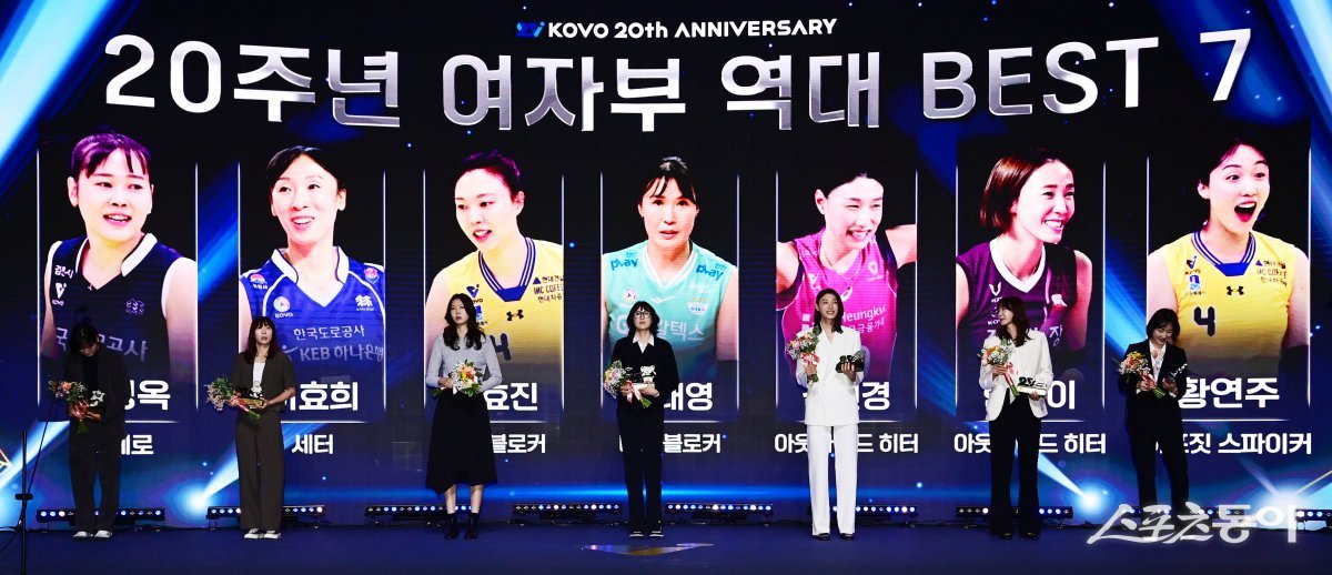 14일 서울 서대문구 스위스그랜드호텔에서 열린 ‘도드람 2024-2025 V-리그 시상식’에서 20주년 역대 여자부 베스트7에 선정된 임영옥, 이효희, 양효진, 정대영, 김연경, 한송이, 황연주가 기념 촬영을 하고 있다. 주현희 기자 teth1147@donga.com