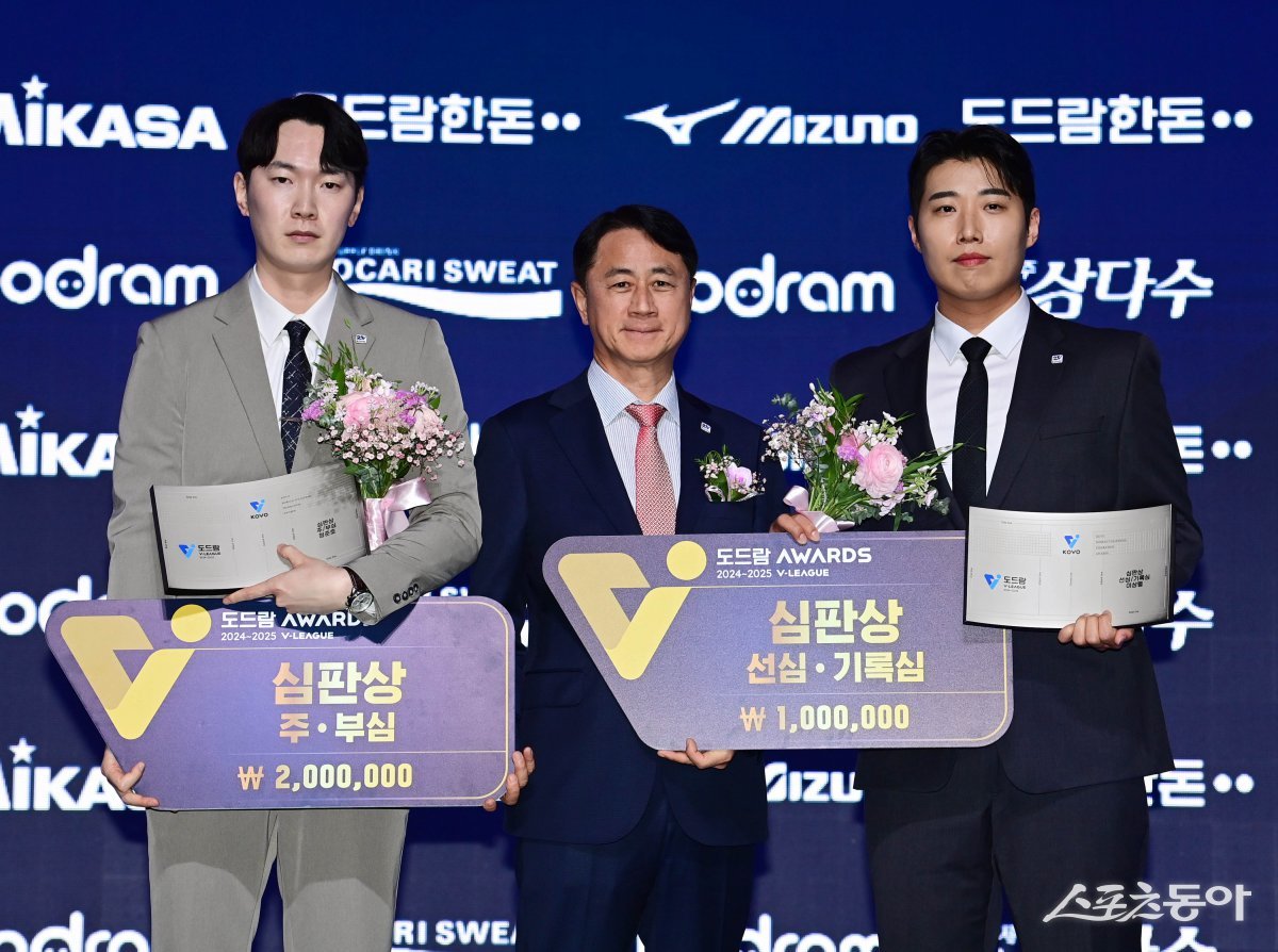 14일 서울 서대문구 스위스그랜드호텔에서 열린 ‘도드람 2024-2025 V-리그 시상식’에서 심판상을 수상한 주부심 부문 정준호, 선심기록심 부문 이상렬이 기념 촬영을 하고 있다. 주현희 기자 teth1147@donga.com