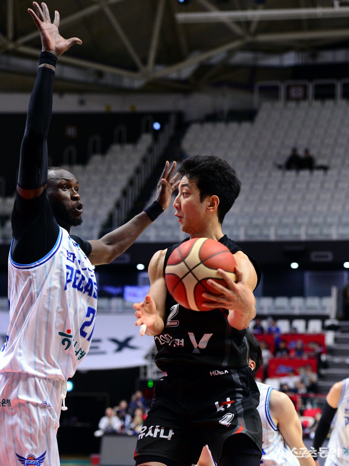 14일 경기도 수원KT아레나에서 열린 ‘2024-2025 KCC 프로농구’ KT와 한국가스공사의 6강 PO 경기에서 KT 허훈이 한국가스공사 마티앙의 수비를 피해 패스를 시도하고 있다. 수원 | 김민성 기자 marineboy@donga.com