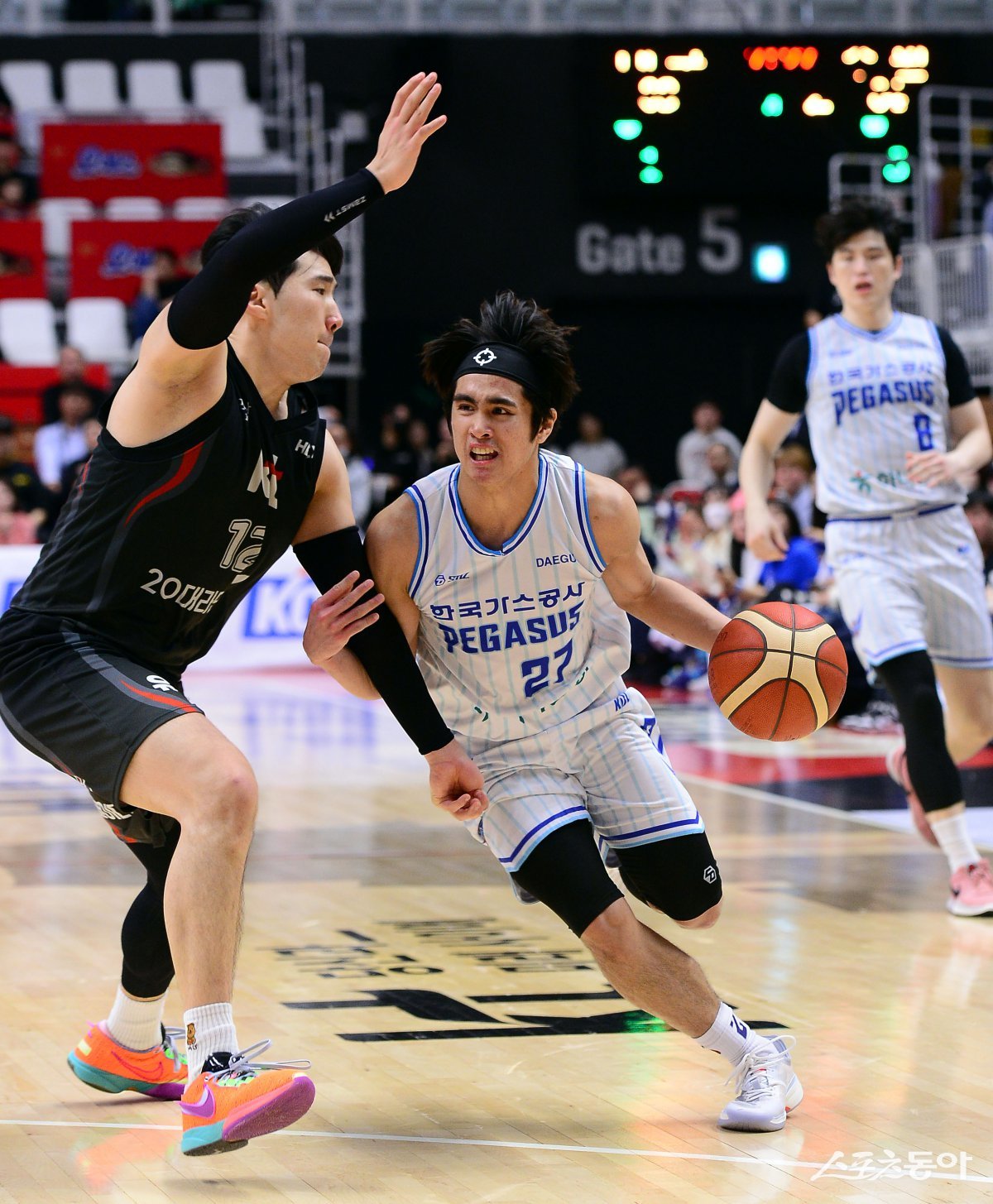 14일 경기도 수원KT아레나에서 열린 ‘2024-2025 KCC 프로농구’ KT와 한국가스공사의 6강 PO 경기에서 한국가스공사 벨란겔이 KT 문정현의 수비를 피해 돌파를 시도하고 있다. 수원 | 김민성 기자 marineboy@donga.com