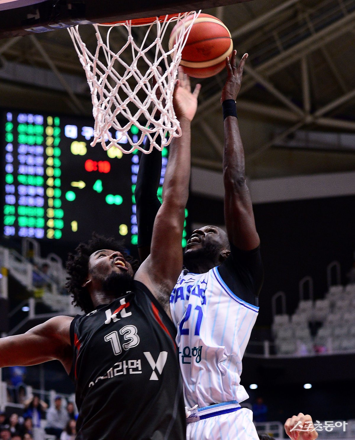 14일 경기도 수원KT아레나에서 열린 ‘2024-2025 KCC 프로농구’ KT와 한국가스공사의 6강 PO 경기에서 한국가스공사 마티앙과 KT 해먼즈가 리바운드를 다투고 있다. 수원 | 김민성 기자 marineboy@donga.com
