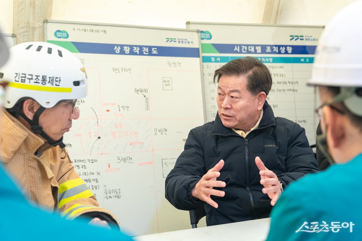 박승원 광명시장이 지난 13일 오전 신안산선 5-2공구 붕괴 사고현장에서 열린 대책회의에서 긴급구조통제단과 구조작업에 대해 논의하고 있다. 사진제공|광명시