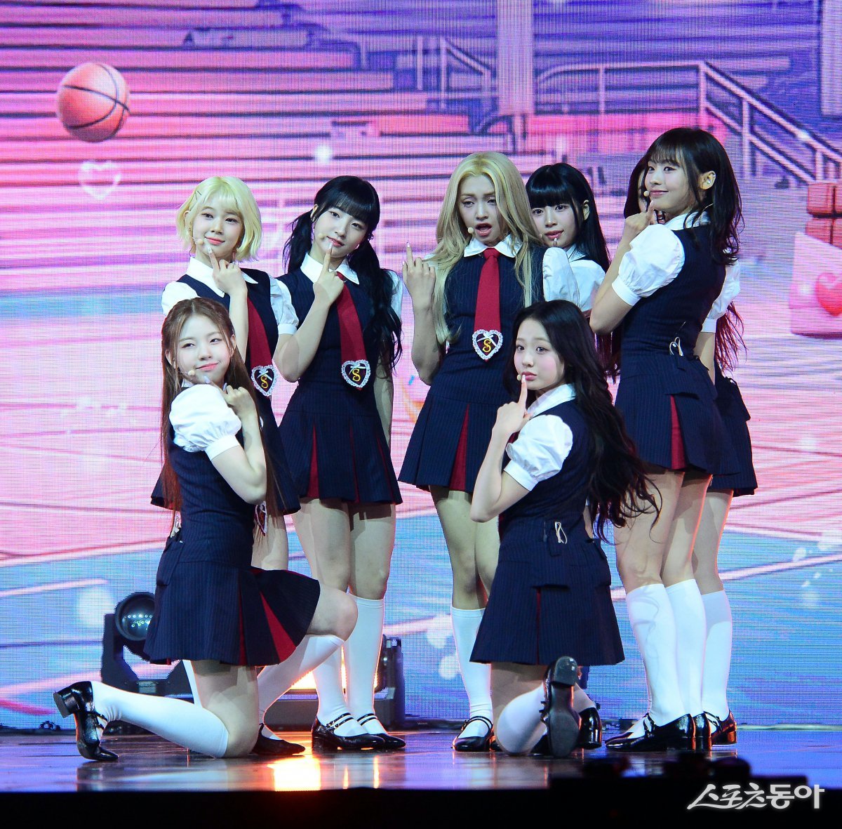 그룹 유니스(UNIS)가 15일 서울 광진구 예스24 라이브홀에서 열린 두 번째 미니앨범 ‘SWICY(스위시)’ 발매 쇼케이스에서 화려한 공연을 펼치고 있다. 김종원 기자 won@donga.com