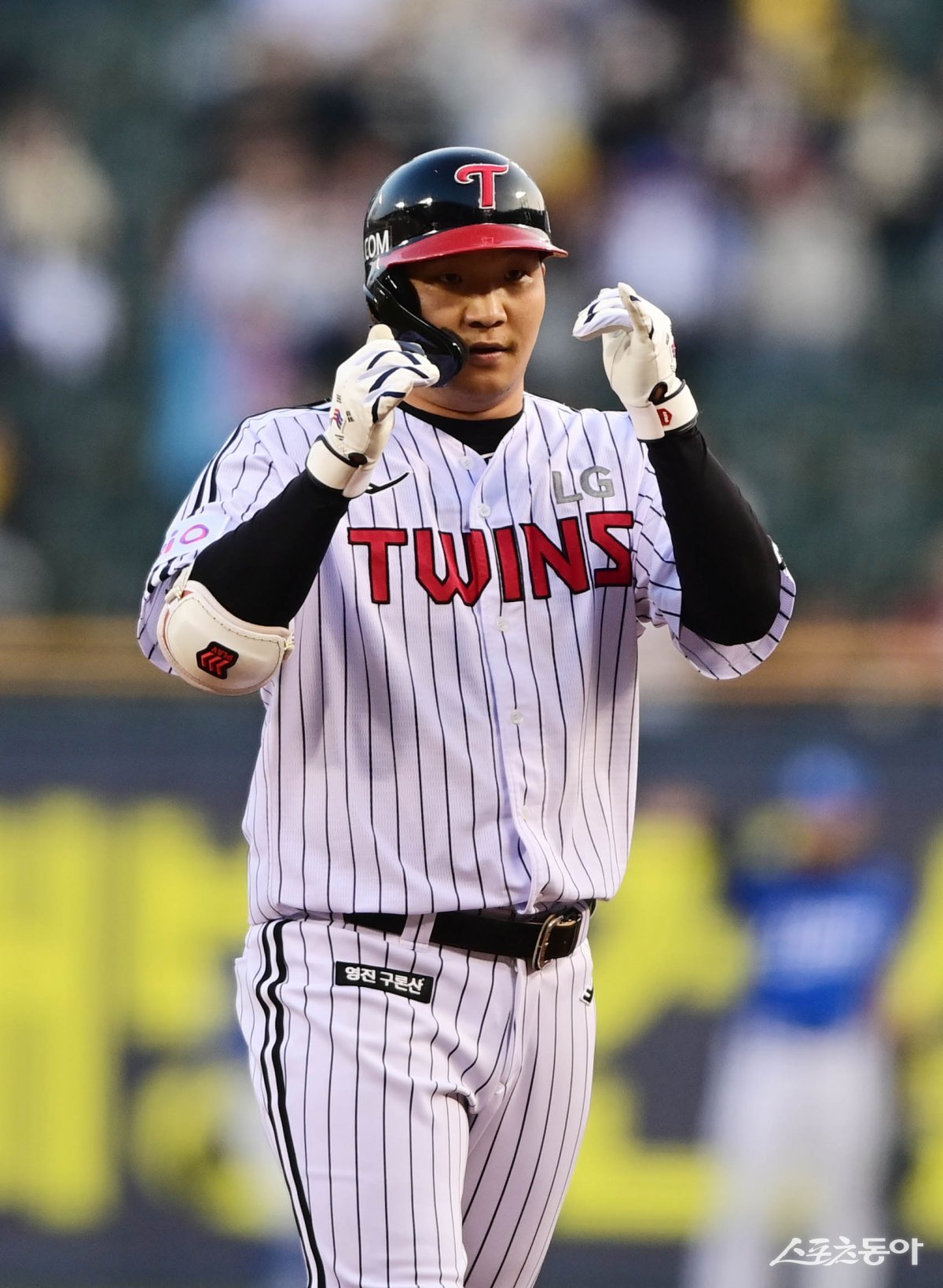 15일 서울 잠실야구장에서 열린 ‘2025 신한 SOL Bank KBO리그’ 삼성 라이온즈와 LG 트윈스의 경기에서 1회말 1사 1, 2루 LG 문보경이 선제 1타점 우전 적시타를 친 후 세리머니를 하고 있다. 잠실 | 주현희 기자 teth1147@donga.com