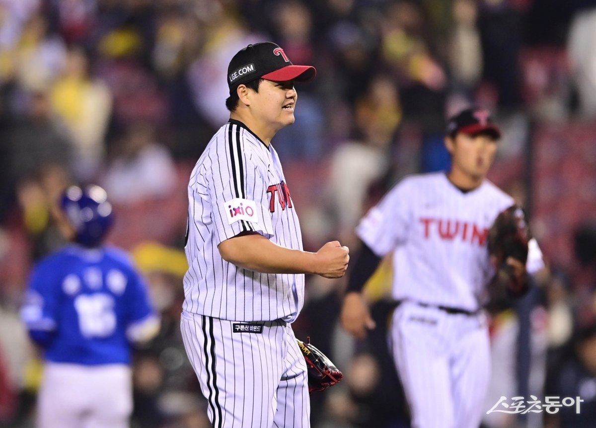 15일 서울 잠실야구장에서 열린 ‘2025 신한 SOL Bank KBO리그’ 삼성 라이온즈와 LG 트윈스의 경기에서 3-0으로 승리한 LG 장현식이 기뻐하고 있다. 잠실 | 주현희 기자 teth1147@donga.com